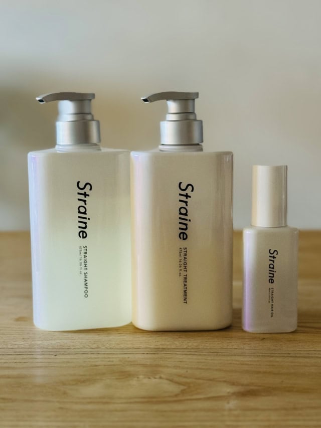 「ストレイン」の商品コンセプト・特徴は、なんといってもストレートな髪質になること。プロ仕様のヘアケア3ステップ、洗う【シャンプー】→補修【トリートメント】→守る【オイル】で、各々がその役割に全力投球するという設計。
