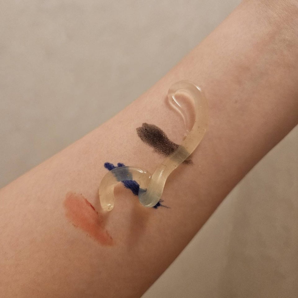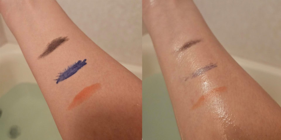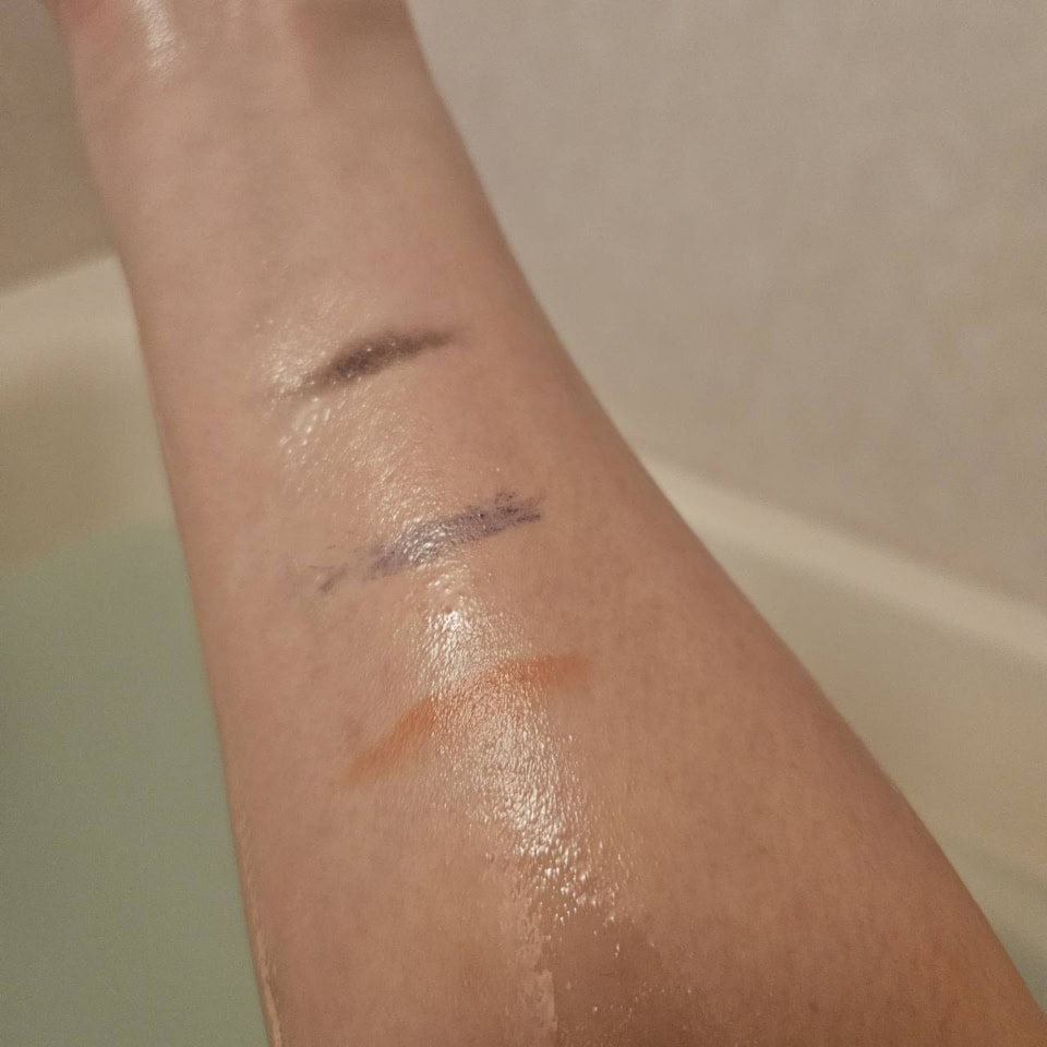 あれ、落ちるかな、落ちないかも!? と焦りながらクルクルし続けていると、ある瞬間を境目にフッと、それぞれの色が薄くなる瞬間がありました。やっぱり、クレンジングって、摩擦はしないで優しくそれなりの時間クルクルして剤と汚れをなじませないと効果がないものね! と謎の感動を覚えつつ、クルクル。そろそろいいかな、と流してみたら、なかなかの落ち具合でした。そもそも顔に墨も顔料マーカーも塗るものではありませんし、唇と腕ではティントリップの乗り具合も落ち具合も、違いますけどね。いいの、細かいことは。