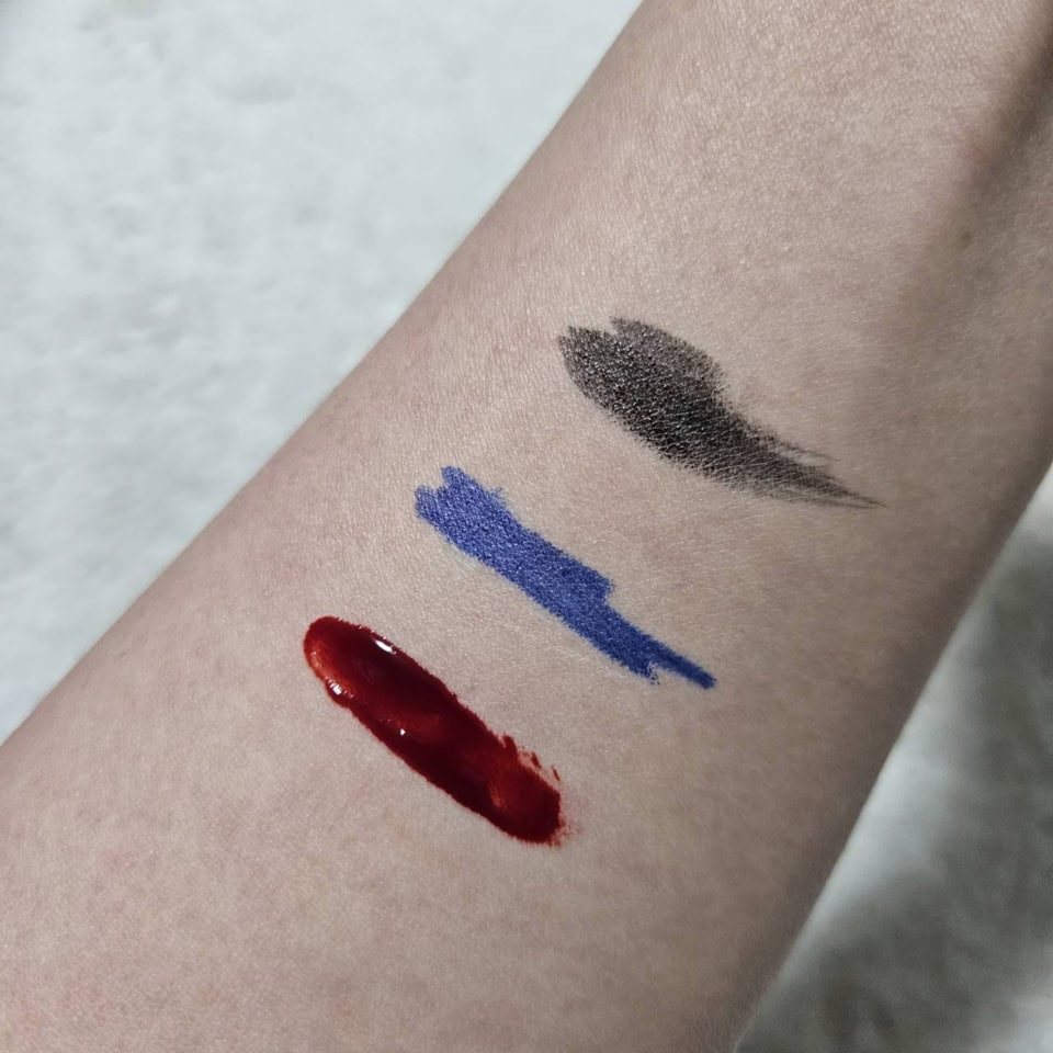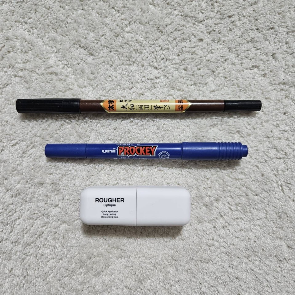 自宅にあった筆ペンと、水性顔料マーカーと、韓国で買ったリップ。黒、青、赤の3種類で勝負だ!