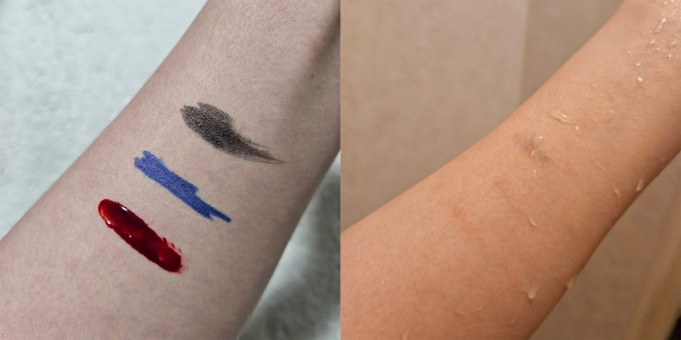そして洗い流す際も普通のオイルクレンジングみたいに時間がかかることはなく、さらっと居なくなります。洗いあがりはとってもしっとりしているのですが何かが残ってる感じは確かになく、全体的に、拍子抜け。感動というより、驚きが大きいんです。なんだこれは……! ちょっと、あまり体験したことのない感じかも。そして「そんなに実力があるなら実験しちゃうわよ」と、私、ちょっとイジワルなことを思いついたのです。オイル要素があるということは油性の汚れにはそもそも、強いはず。だったら、「墨汁」「水性顔料マーカー」「沈着するタイプのティントリップ」この、肌に残りがちな3つのアイテムの落ち具合を試してみようじゃないの!