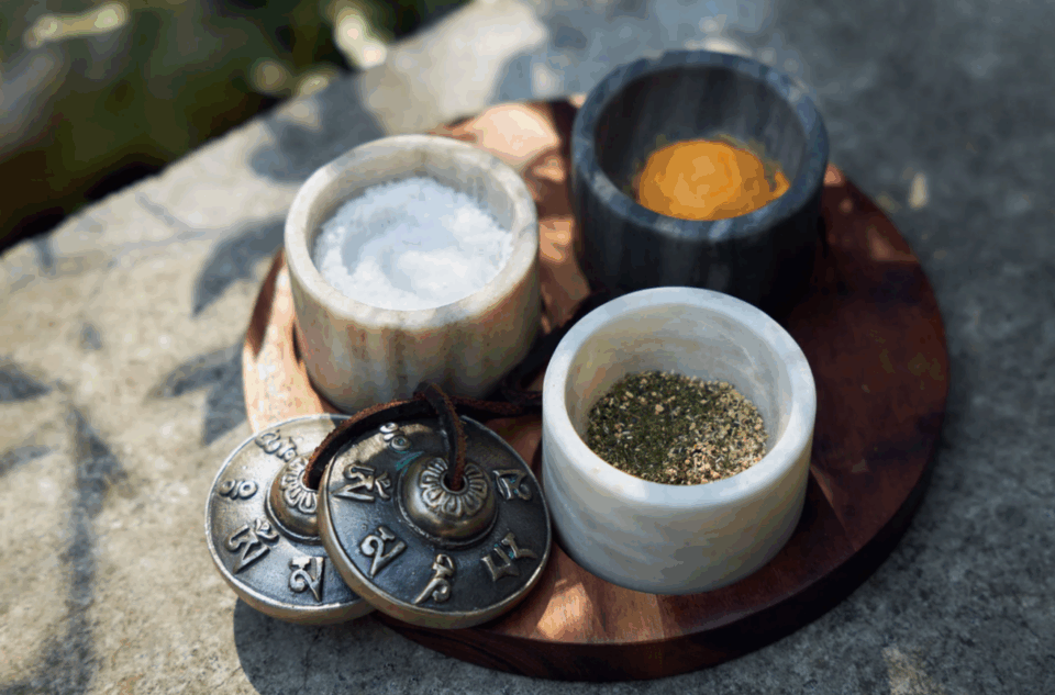 お清めの塩、ハーブなどを足湯に。香りはもちろん、ティンシャの優しい鐘の音がスーッとからだに入ってくる気分。