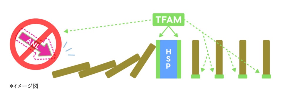 従来より研究のテーマとしてきた二つのタンパク質(本来の若々しさを保つ「HSP」/ 肌悩みを加速させる「ANL」)のコントロールに加え、ミトコンドリアの最新研究過程で新たに出合った、第三のタンパク質「TFAM(ティーファム)」に着目。