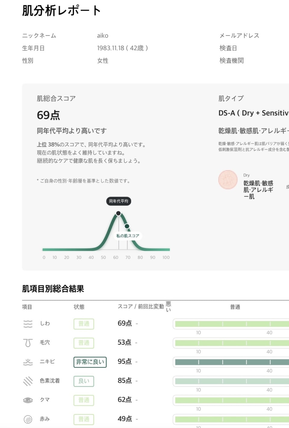 私の結果はこんな感じ。上位38%とよいほうだそうですが、自分的には結果には満足できず。毛穴の開きや赤みが気になっていたのですが、ずばり指摘されました。