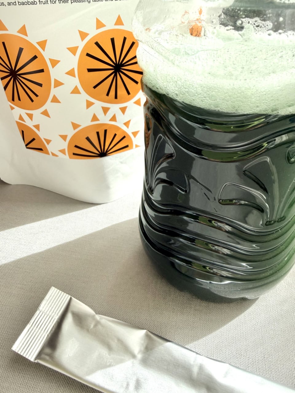 このお茶には、ブルーグリーンアルジーに加えて、べにふうきやジャバラといった、アレルギー反応を穏やかに抑えることが期待される素材をブレンド。さらに、水溶性食物繊維のイヌリンも配合されていて、花粉シーズンの揺らぎに、内側から多角的にアプローチしてくれる設計なんです。