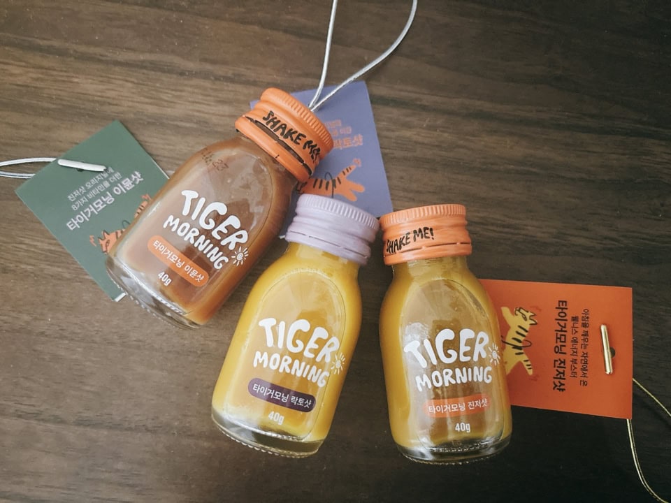 お店でひときわ目立っていたのが、このTIGER MORNIGシリーズ。ジンジャーをベースに作られた機能性ドリンクです。朝の目覚めや代謝をサポートする目的で取り入れられているもので、メイン3種類を購入してみました。