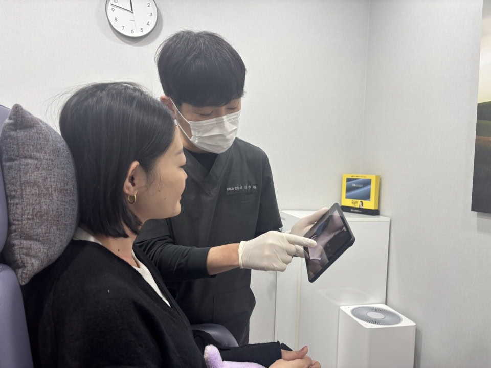 また、フィラーが終わると、事前に撮影したビフォーの写真と合わせて、どの部位にどのように入れたのかやダウンタイムについても詳しく説明してくれました。きちんと私の悩みに向き合ってくれるのが伝わってきてありがたい! そして、肝心の痛みについてですが、たまにチクリと感じる程度。普段受けているスキンブースター(注射で成分を注入するもので顔への施術が主)に比べたらなんてことはありませんでした。