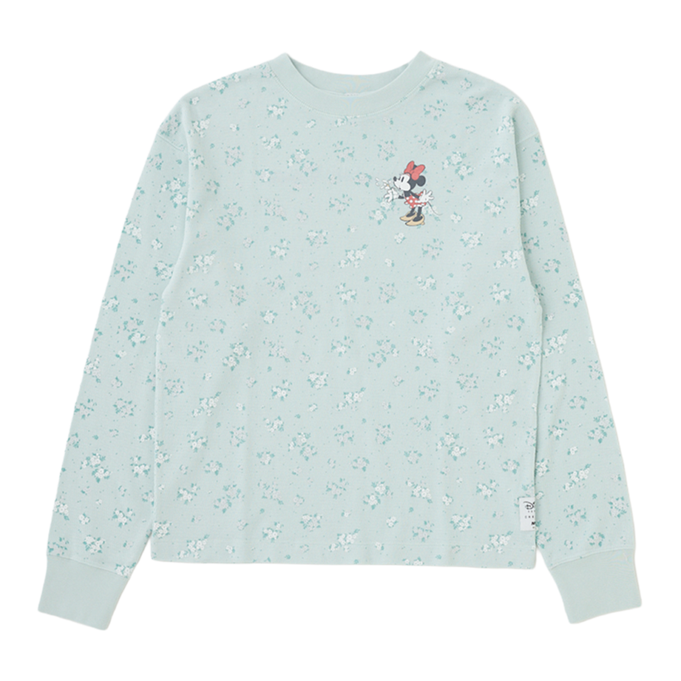ミニーマウスのワンポイントが入った小花柄のサーマルTは春らしい装いにぴったり。