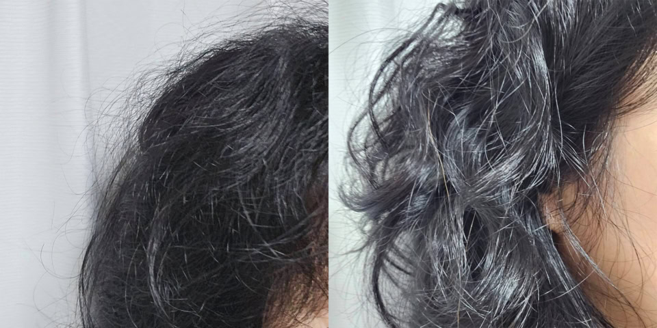 【SINORU】比較はこんな感じ。左が普段、右がSINORU4アイテム使用時の翌朝です。パサつきなし!