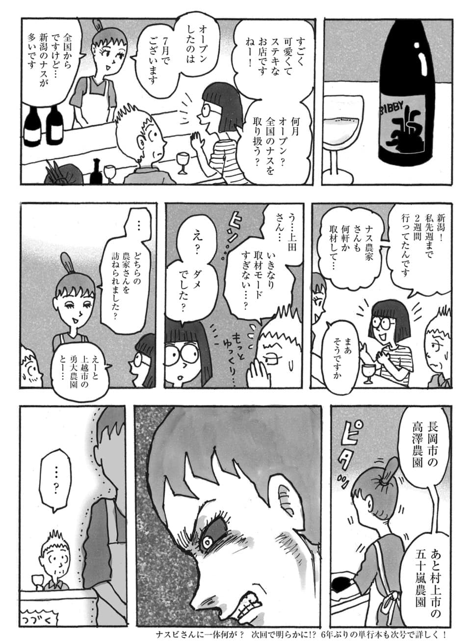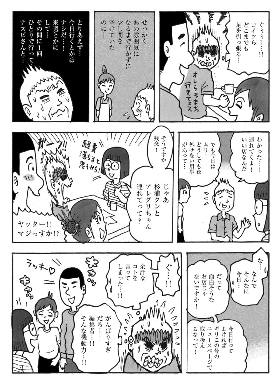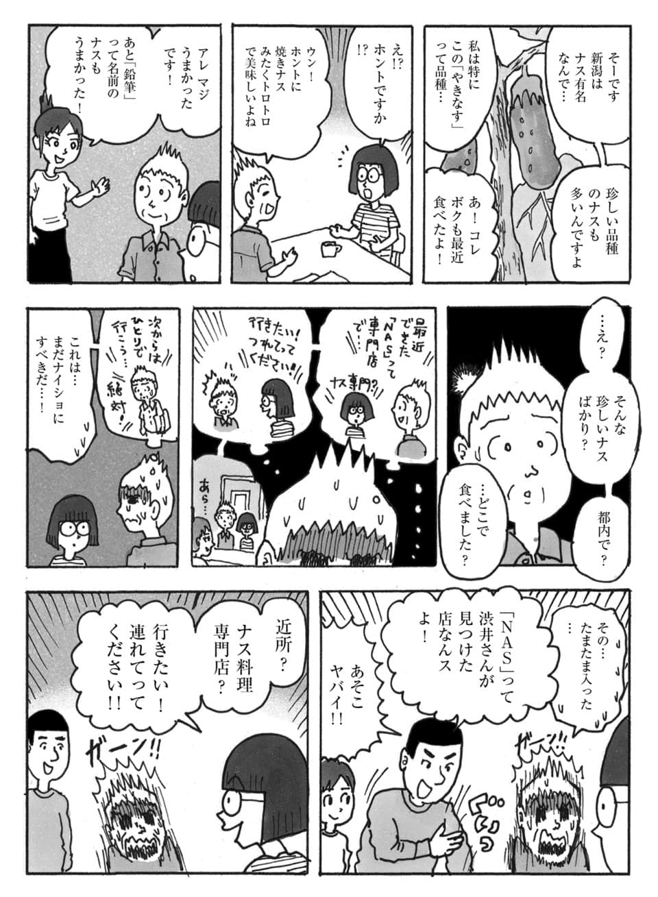 ナス料理専門店を切り盛りする上品でミステリアスな女将「ナスビ」さんをすっかり気に入り通い詰める渋井さん。後日アレグリと杉浦くんを連れていくも、雰囲気にそぐわない若者二人の語彙が炸裂!? それを見た女将さんの笑顔の真意が読めない渋井さんは内心ヒヤヒヤ…