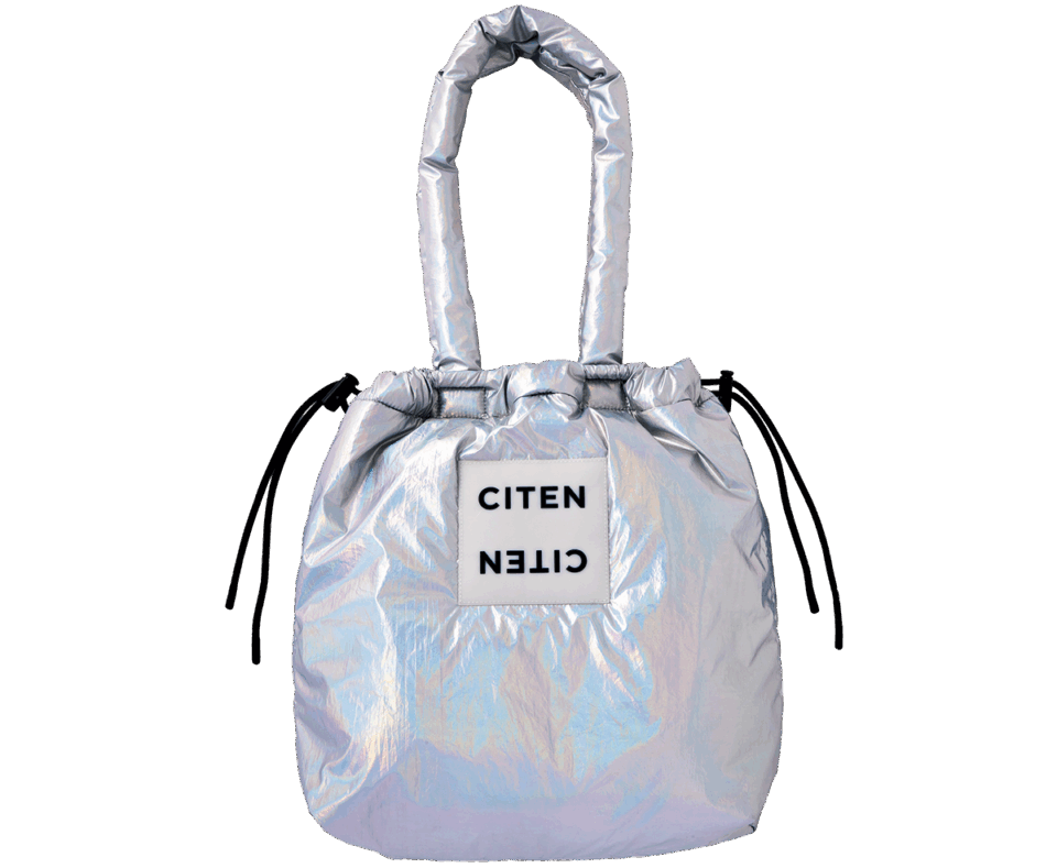 ストッパー付きドロストタイプの開口部で荷物の中身が見えない仕様。シャイニーなシルバーカラーは意外とどんなコーデにも合わせやすい。