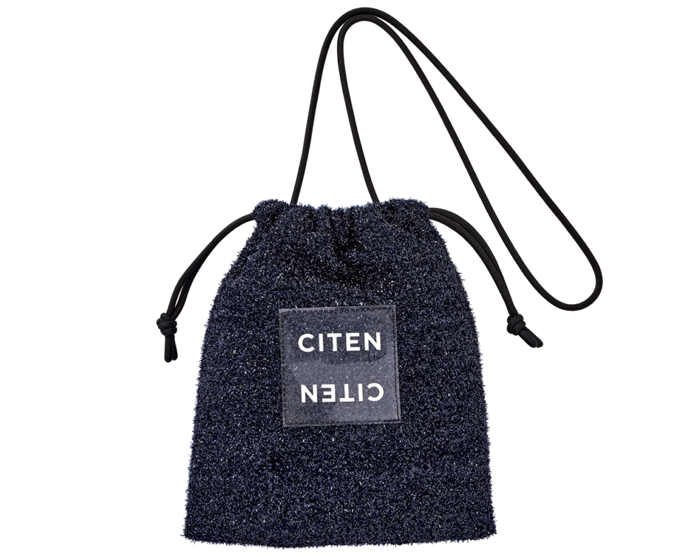 シャリ感のあるキラキラ素材はちょうどいい華やかさ。斜め掛けでも、手持ちのキンチャクとしても使える2WAY。