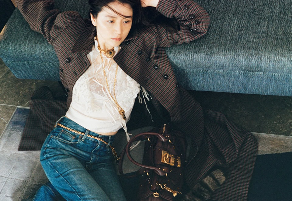 ハウンドトゥースコート¥898,700、レースチュールトップ¥412,500、レースキャミソール¥243,100 ※参考価格、フェードインディゴトラウザーズ¥178,200、チョーカー¥157,300、ネックレス¥122,100、左手人さし指のリング¥73,700、左手中指のリング¥73,700、ベルト¥139,700、ベルトに付けたチャーム¥122,100、バッグ[パディントン]¥398,200、バッグに付けたテールキーリング¥122,100(全てChloé/クロエ カスタマーリレーションズ)