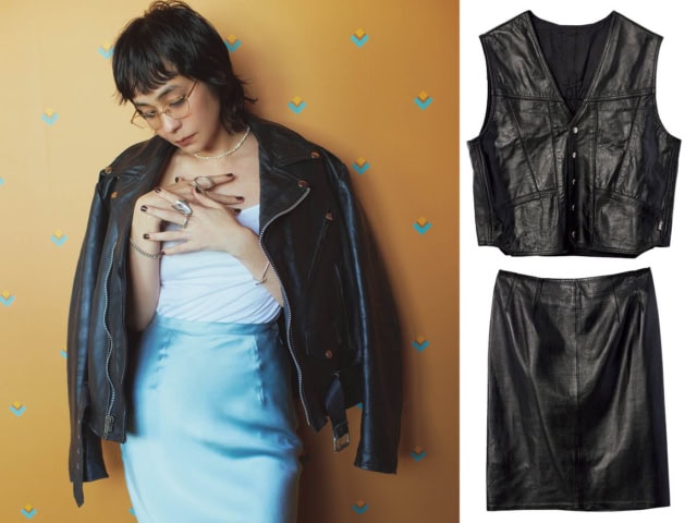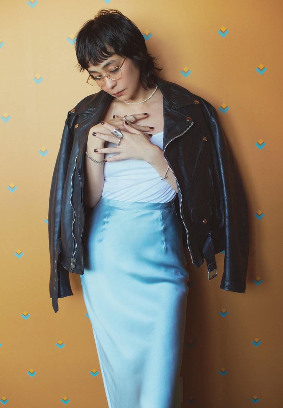 ★ライダースジャケット¥41,800(アンバーヴィンテージ)、トップス¥17,600(ヨー ビオトープ)、スカート¥38,500(エディット フォー ルル)、メガネ¥54,780(オリバーピープルズ/ルックスオティカジャパン カスタマーサービス)、ネックレス¥16,500(SEA/エスストア)、右手ブレスレット¥31,900、右手人差し指リング¥55,000、左手ブレスレット¥26,400、左手人差し指リング¥59,400、左手中指リング¥27,500(全てラムダ)