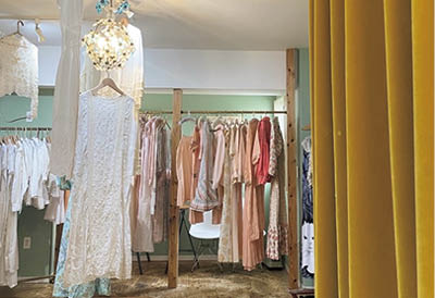 レースやフリルなど心ときめくフェミニンなアイテムが充実。ギャラリーのような空間に1点1点丁寧にセレクトされたヴィンテージが並ぶ。