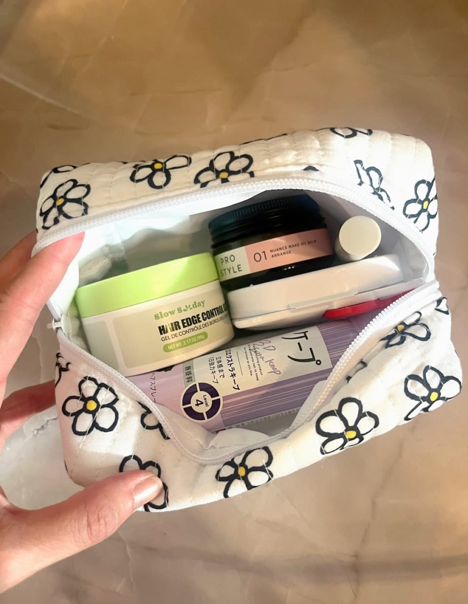 大きめのポーチには、娘のダンスイベントのときに使うヘアメイクアイテムを収納。たくさん入るし、中にクッションがあるので、落としても中のものが割れにくいです。マチもしっかりあるので、たっぷり入ります!
