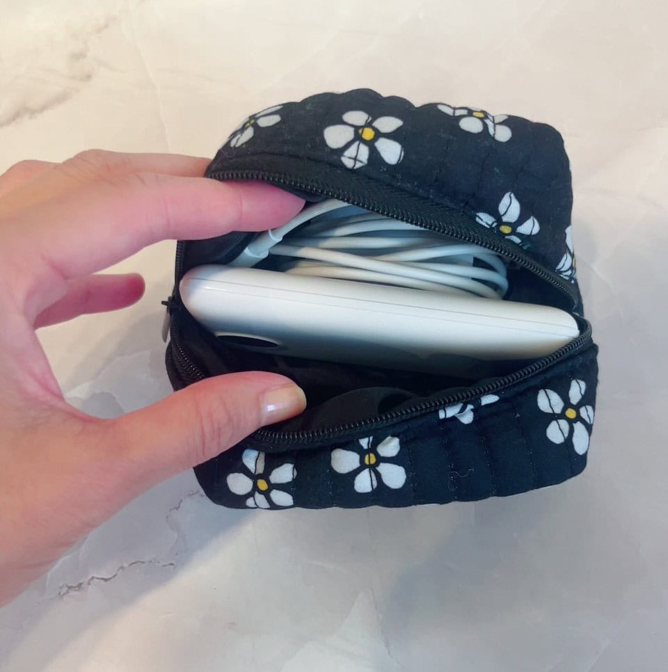 小さなポーチには、モバイル充電器などを収納しています。