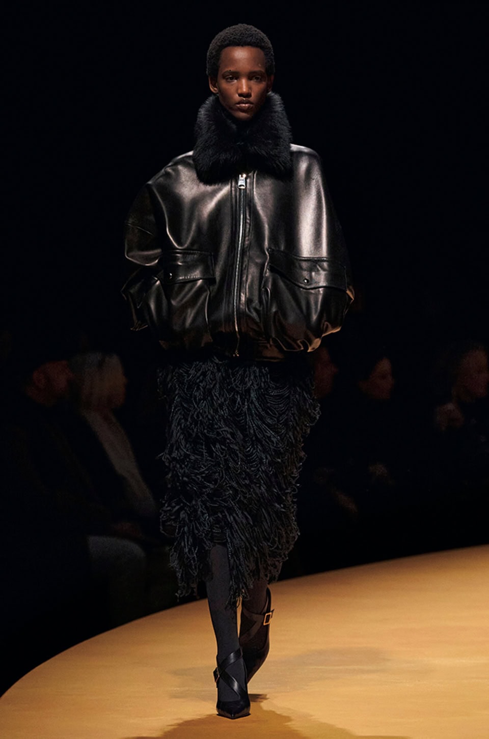 秋冬のおしゃれ基軸、アウターで、二人の心を捉えたのは、トレンド的にも大注目のレザーブルゾン。大物買いはシーズン初めに、のお手本のごとく、取材した7月末の時点で既にイットな一着を入手済みの二人。綾さんはレディなノーカラー、百々さんはパーカ感覚で着られるフード付き。同じプラダの黒レザーを選んでいても、キャラの違いでここまで変わる。面白いですよね。