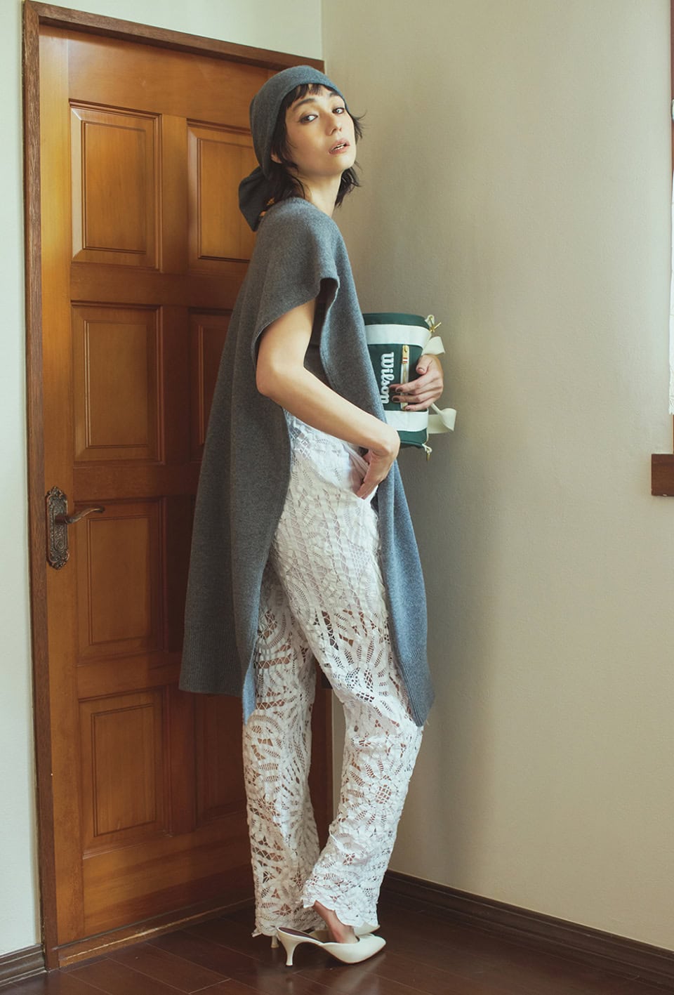 ★レースパンツ¥29,700(ゾハルヴィンテージ)、ケープトップス¥61,600(レハ)、頭に巻いたスカーフ¥26,400(エクストリーム カシミヤ/共にユナイテッドアローズ 六本木ヒルズ店)、中に着たタンクトップ¥3,080(ヘインズ/ヘインズブランズ ジャパン カスタマーセンター)、バッグ¥5,500(ウイルソン/アメアスポーツジャパン・ウイルソンお客様センター)、ミュール¥151,800※参考価格(ネオス/ザ・ウォール ショールーム)