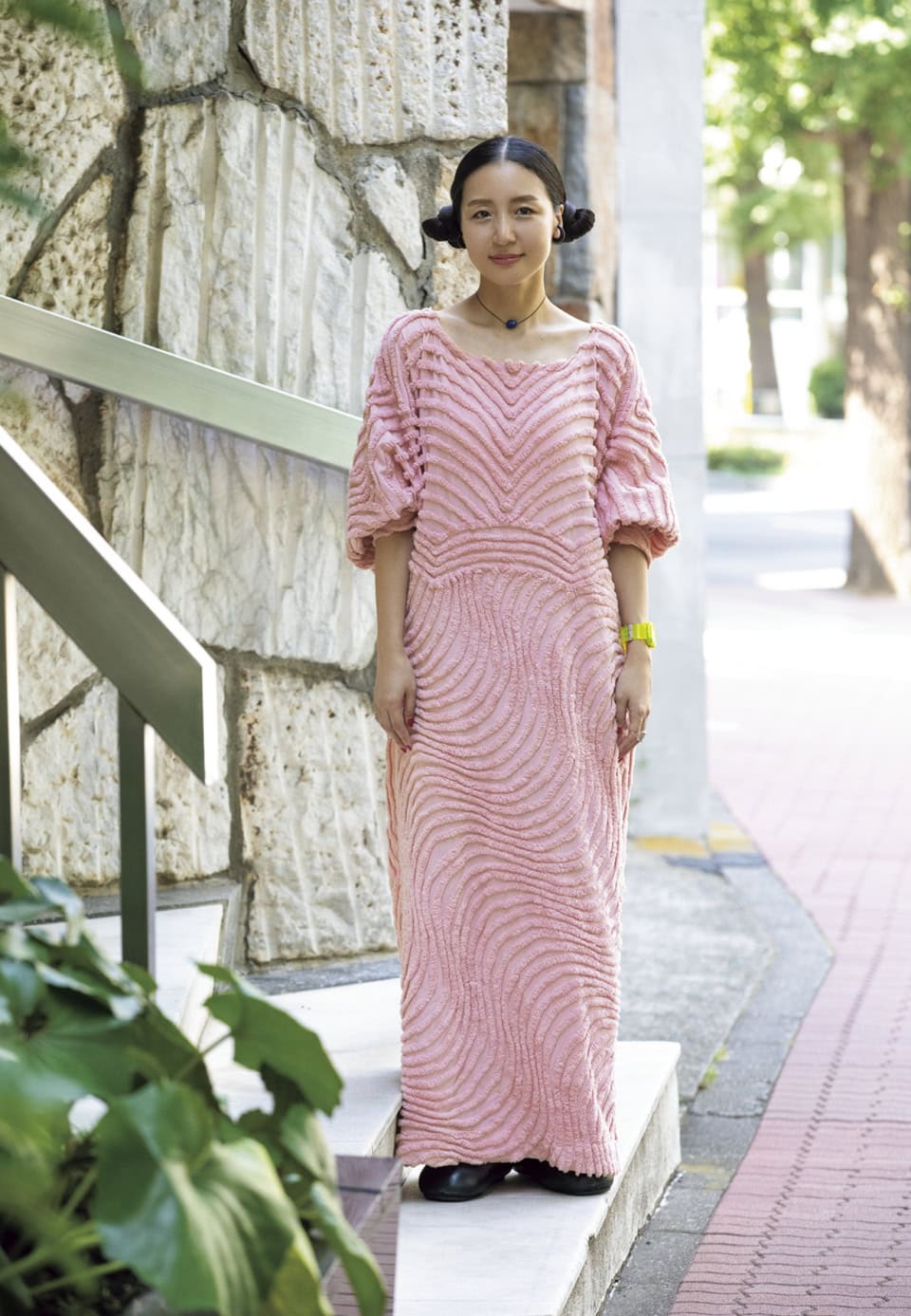 「ビオトープが開催したフリマで、ファッションデザイナーさんが出品されていて一目惚れしたヴィンテージのドレス。キレイなピンク色や立体的な織り柄はもちろん、スリーブのシルエットも気に入っているので、袖をグッと上げてボリュームを強調して着用しています。存在感たっぷりのドレスなので、それに負けないくらいインパクトのあるシューズを合わせています」