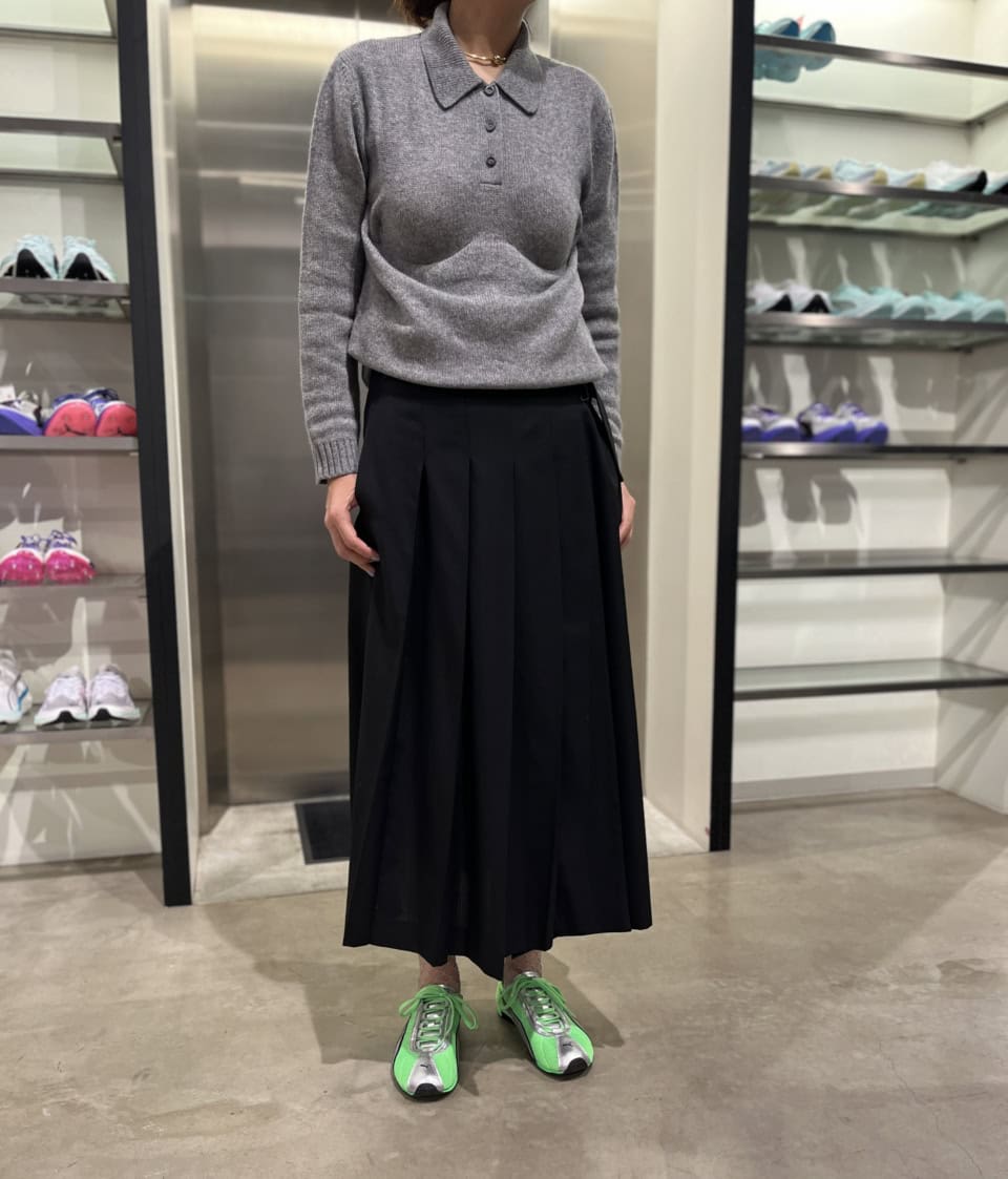 そこでニットポロとプリーツスカートのトラッドな着こなしにプラス。いつもならローファーを合わせるところですが、パッと目を惹くネオンカラーのスニーカーだとスタイリングが見違えますね。なんだかモードな雰囲気も漂うし、洒落度も格段にアップしています。