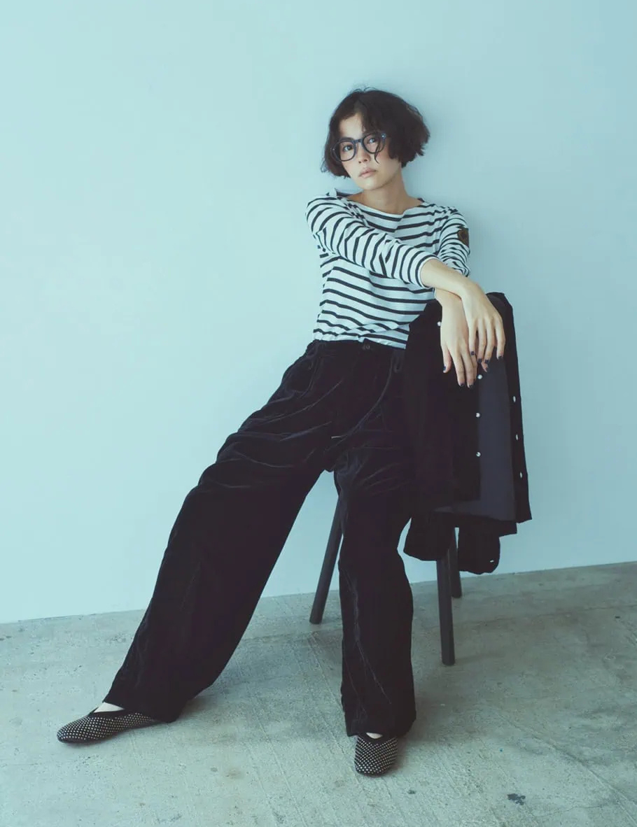 リッチなムードのベロアはボーダートップスで気負わず着るべし