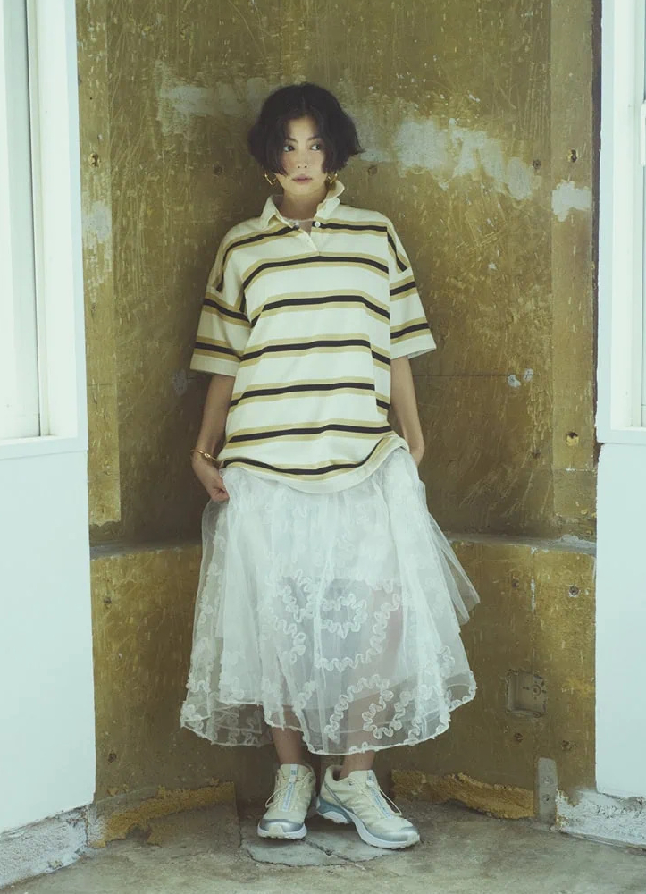ドレス¥26,400(メゾンスペシャル/メゾンスペシャル 青山店)、ポロカットソー¥17,600(ザ ポーズ/ウィム ガゼット ルミネ新宿店)、スニーカー※別注¥19,800(サロモン/ロンハーマン)、ピアス¥59,400、バングル¥111,100(共にマリア ブラック/マリア ブラック 表参道店)