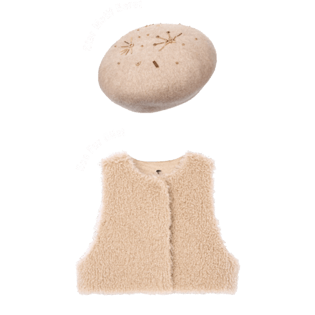 ジャパンメイドの上質ウールが自慢のバスクベレーは、夜空の星たちをイメージした金属モチーフがハンドメイドで縫い付けられ、何とも印象的な風貌。撥水加工に加え、内側に付いたテープでサイズ調節できるのも魅力です。ワイドなフォルムで、さっと羽織るだけでサマになるエコファージレも強い味方に。