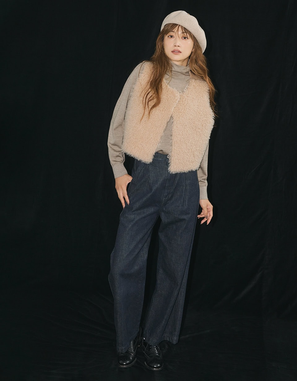 デザイン性のあるニットに、何かひとつ。ツイードベースにファーをあしらった、独特のボリューム感が目を引くハットをON。カジュアルな着こなしにスッとなじみ、レディな表情に寄せてくれる頼もしい一品です。
