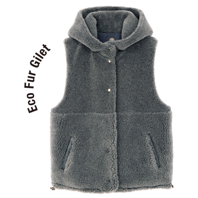 ムートン調のもふっとしたボリューム感が今の気分にフィットするエコファージレ。こんなふうに被ってもこなれた感じに仕上がる、計算ずくのフードも高得点。白シャツの首元にのぞかせたシルクスカーフで華やかに。