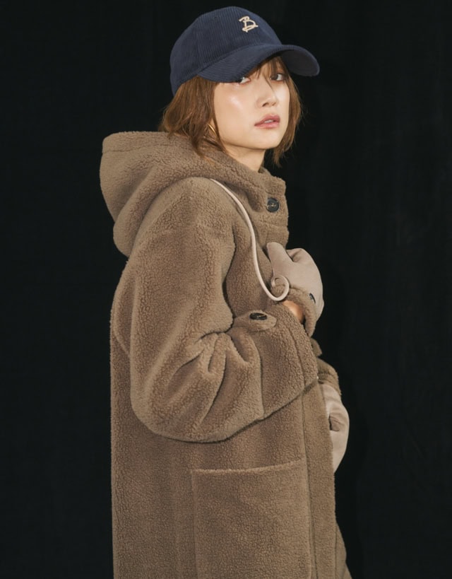 上:被ると大人っぽくシックな雰囲気。ヨンア着用のベージュの他、ネイビー、オフホワイト、ブラックも。下:スタンダードな服装にさらりと合わせたい今季のファー。しかもリバーシブル仕様!