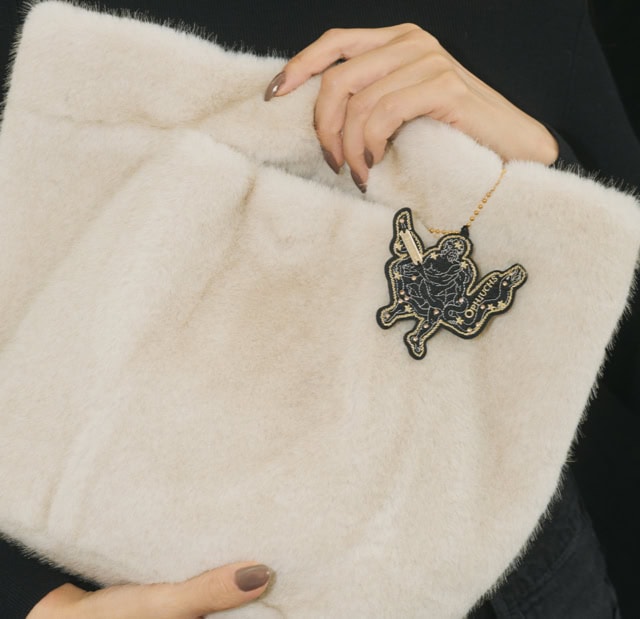スタイリングのポイントとして、ひとつ持っておくと重宝するのがファーバッグ。ラフに持てるハンドバッグ型のこちらは、エコファーの質感も心地よし。刺繍プレートのキーホルダーには、へびつかい座を意味するラテン語が。