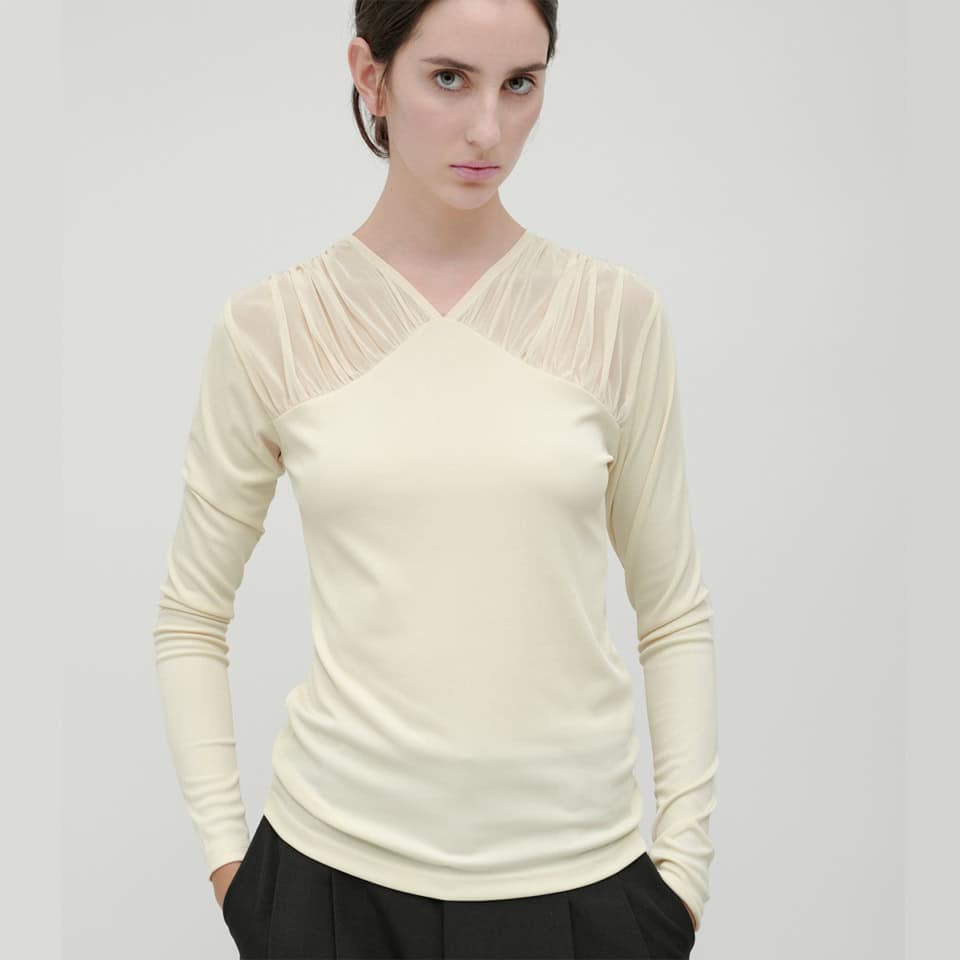 ギャザーチュールヨーク部分の透け感とチュールの柔らかい動きでデコルテを綺麗に見せ、体のラインを拾いすぎないフィット感。カットソー部分はリブ素材ながら細めのシルエットでエレガントにまとまる。 チュール ドッキング トップス[ivory/gray/black]¥7,700