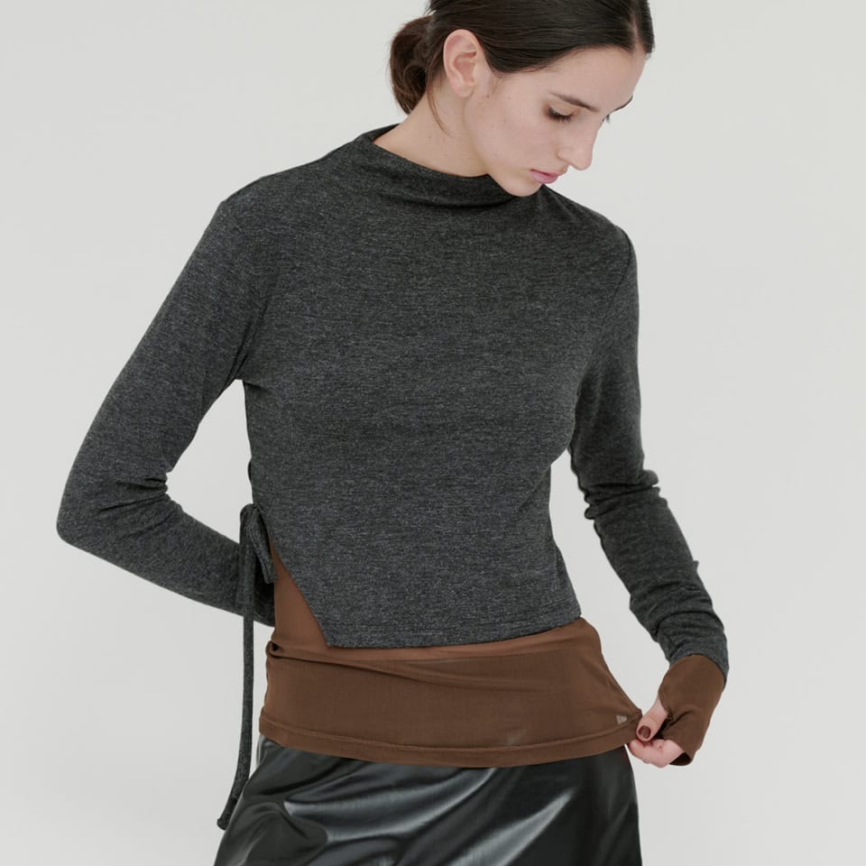 サイドのスリットとリボンコードが印象的。スタンドネックと短め丈でスタイルアップも叶う。程よい厚みは透け感を抑えロングシーズン着用可能。スムース サイドスリット トップス[ivory/gray/black]¥6,600