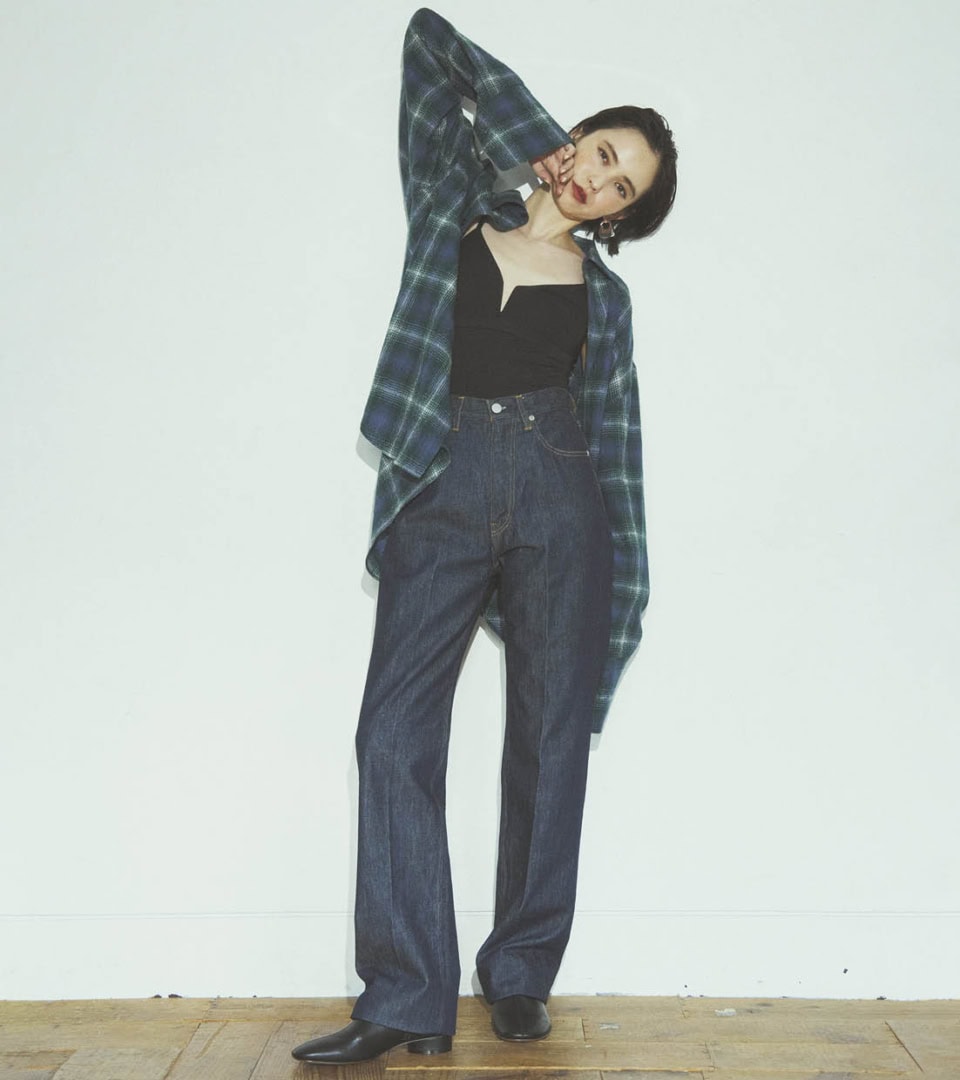 インナーがキャミだと、自然とヌケ感が出て◎。メンズライクなシャツを羽織った媚びない肌見せ具合がポイントです。多少着崩しても品のよさをキープできるのが、キレイめデニムの素晴らしいところ。