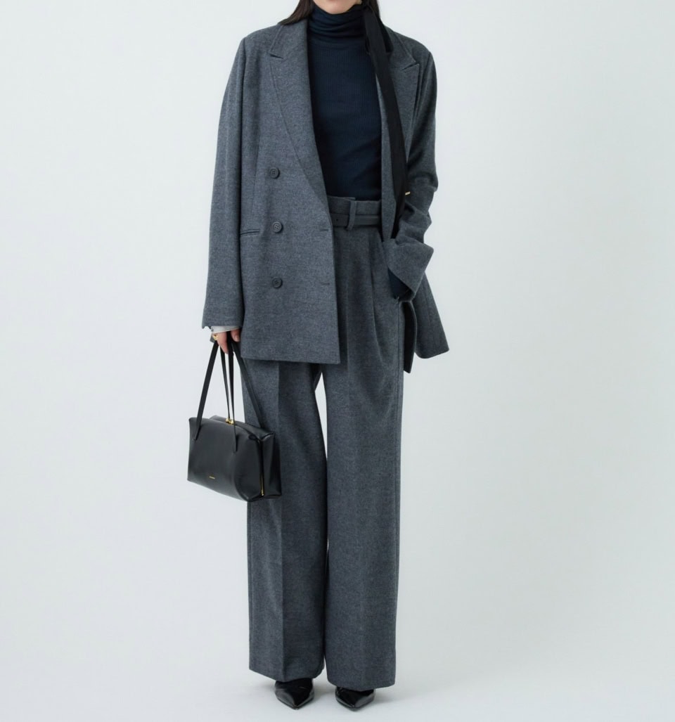 ジャケットは、一枚仕立てのさらっと羽織れるダブルのオーバージャケット。パンツは2タック入りのややワイド目で、ストレートシルエット。ウエストの後ろ部分にはゴムが入っているので、座ったりしゃがんだりしても背中側が気になりません。まるでスウェットパンツを着用しているかのような錯覚におちいるほどのラクさです。移動時も快適に過ごせるので、出張などにもオススメですよ。