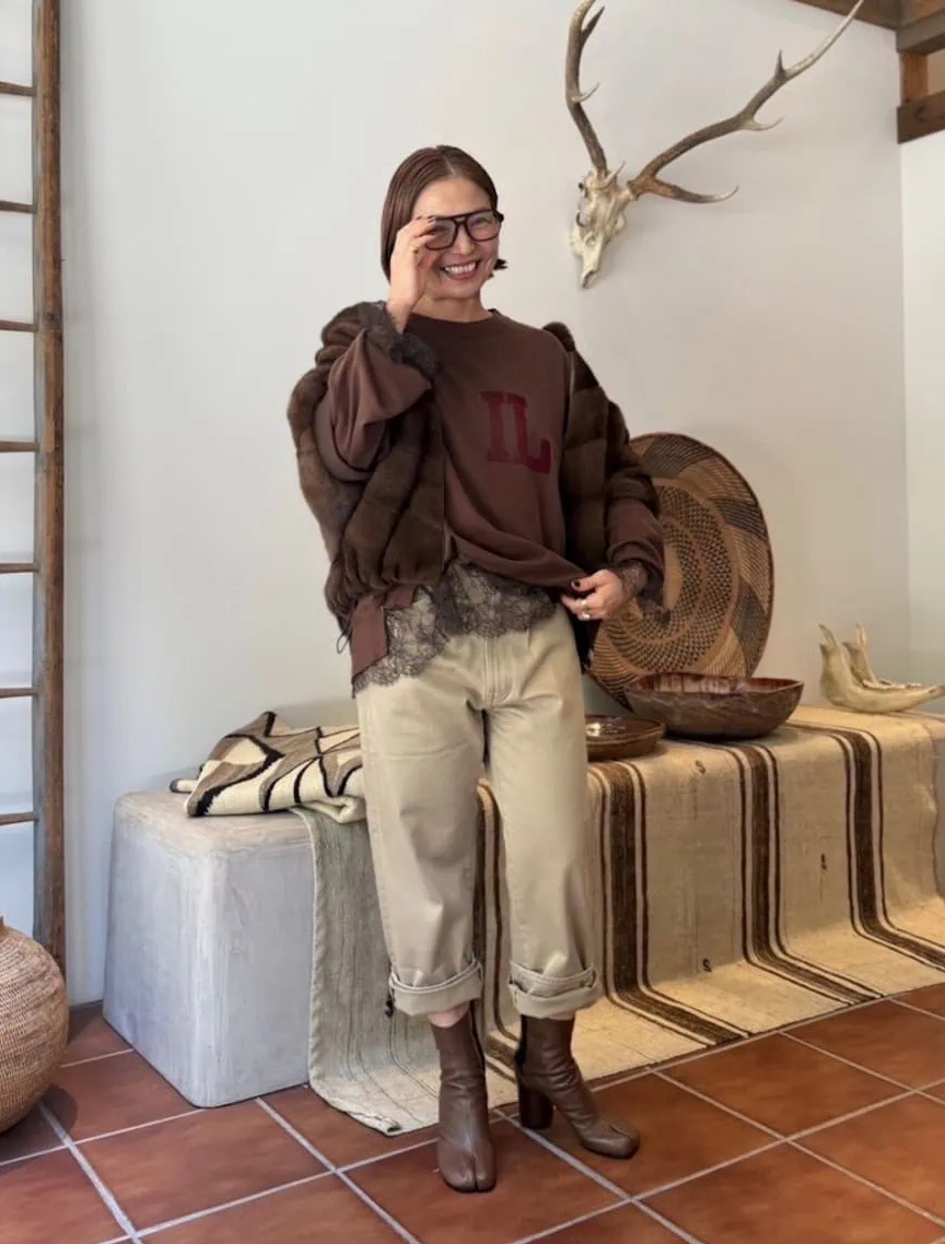ブラウンを基調としたコーディネートのポイントもやはりレース。こちらはスエットの下に長袖のレースブラウスを重ねて、袖口と裾からチラ見せ。トーンをまとめているぶん、ファーやスエット、レースなど異なる素材を用いることでニュアンスたっぷりの着こなしを実現。