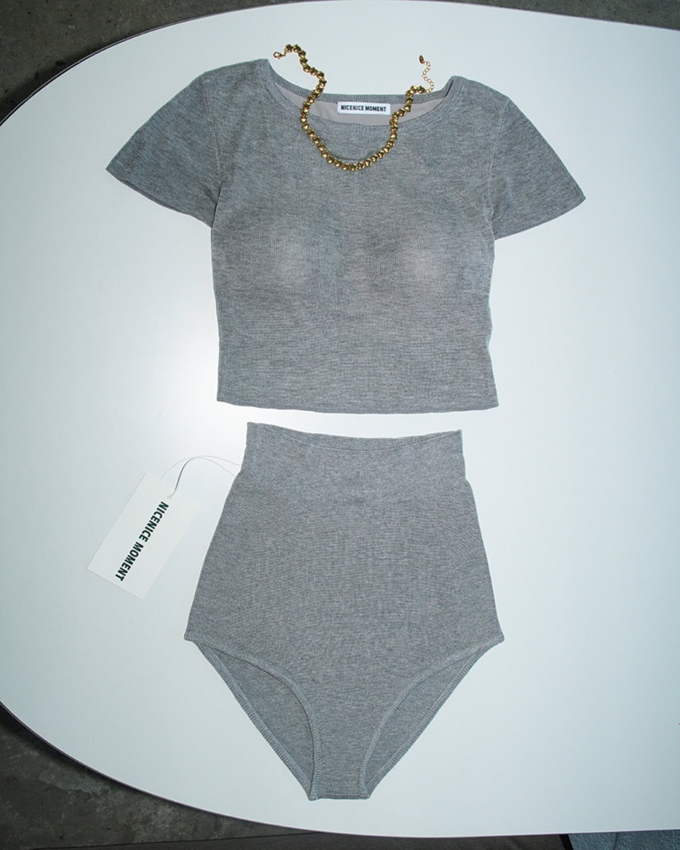 カップ付きニットトップス¥20,900、ニットショーツ¥19,800(共にナイスナイスモーメント/ショールーム リンクス)、ステラハリウッドのハートネックレスは本人私物