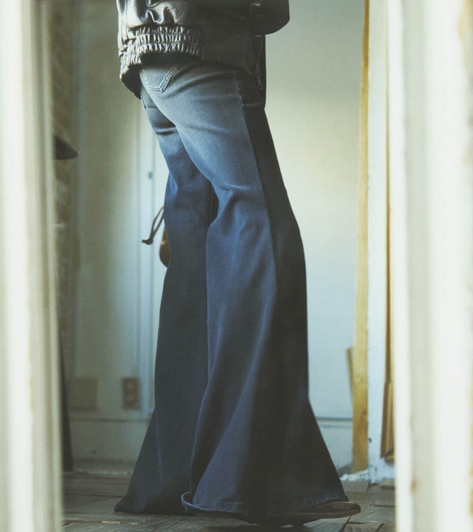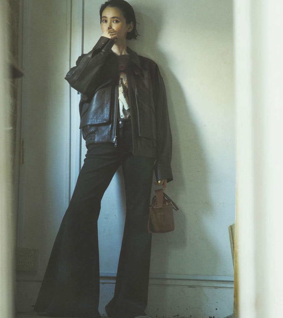 パンチのきいたTシャツとデニムで、いつもより少しだけ攻めたスタイルに。とはいえ、ベルボトムがキレイめなブラックなので、大人の品格はキープ。トレンドのレザーは、コーデ全体の引き締め役としても効果的で頼りになります。