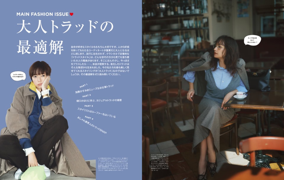 まずはオトナミューズのスタイリングには欠かせないスタイリスト・加藤かすみさんに教えていただいた『加藤かすみ的ミューズなお仕事トラッド』特集。まあ、お仕事はしていてもしていなくても、正直どちらでもいいじゃないですか。セットアップとか、ジャケットとか、タックパンツとかこう、どちらかというと「きちんと見え」する方向性のアイテムをどうやったらとびきりおしゃれに着られるかという、挑戦ですね。スーツを普通に着るだけだったら、ぶっちゃけ、ファッション誌要りませんからね。「とびきり」おしゃれに着たいから、必要なんです!