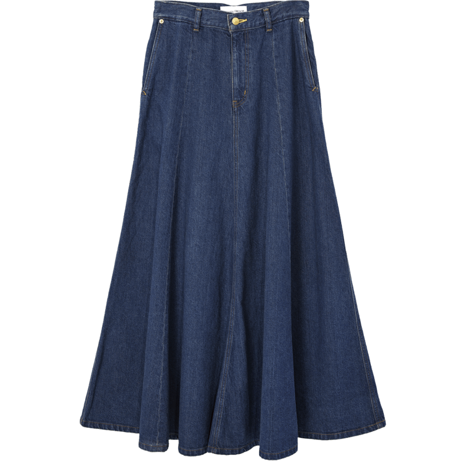 「久しぶりにデニムスカート気分じゃないですか? これはマキシ丈で、ちょっとズルッとはきたいなって。足元は秋はまだビーサンでもいいですよね」
