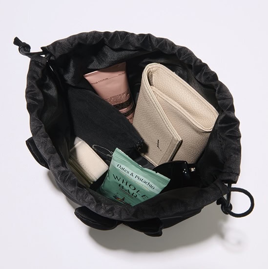 丸型でマチがしっかりとあるポーチは収納力も抜群。巾着なので荷物も取り出しやすくて使いやすい!
