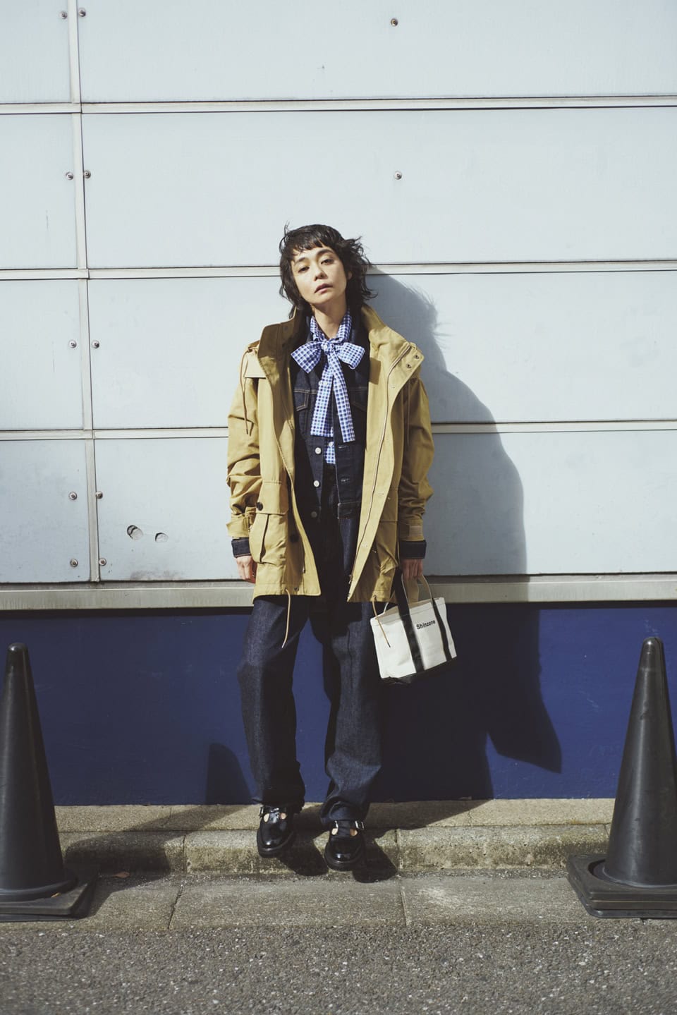 デニムパンツ〈マリリン〉¥34,100、デニムジャケット¥41,800、マウンテンパーカ¥59,400(全てザ シンゾーン)、シャツ¥97,900(リトコフスカ/全てシンゾーン 表参道本店)、シューズ¥69,300(サクラ/インターリブ)