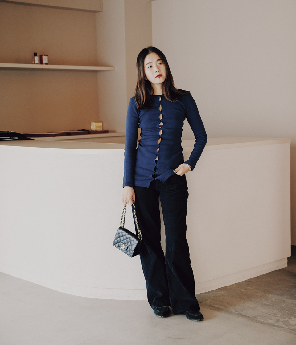 愛用しているSHISHIKUI×HARUTAのローファーを主役に、11月の気分にフィットするスタイリングを披露してくれた百々さん。「このコーデュロイパンツみたいな、ゆったりしたボトムが気分だから、ローファーのはき方も変わってきたのかも」。ネイビーとブラックのシックな色合い、チラッと覗くストラップブラのパープルもおしゃれ。
