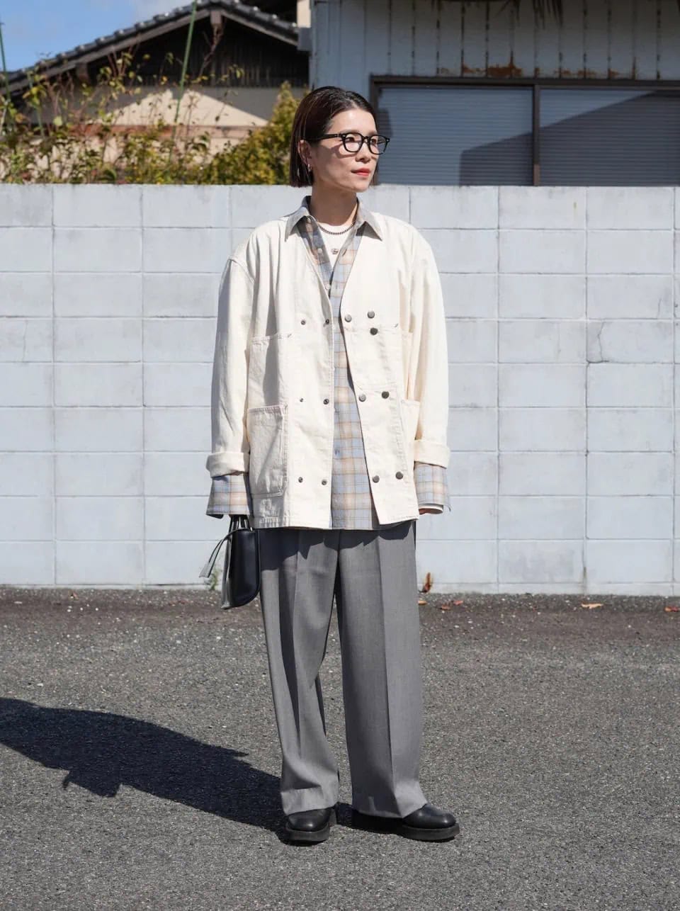 全身のトーンに合わせた優しいチェックをインナーとしてチラ見せすることで、主張しすぎずスタイリングの程よいアクセントに。チェック=派手、合わせにくいというイメージを持っているなら、こんな淡いトーンを選んでみるのも手。ブラックの眼鏡やバッグ、シューズでピリッと引き締めているのも◎。