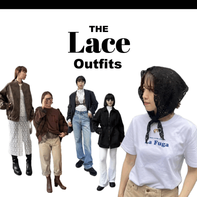 レースを使った小物も今季は人気! スタイリングにもの足りなさを感じたとき、レースのスカーフをバブーシュカのように頭にオンすればアカ抜けコーデが完成します。