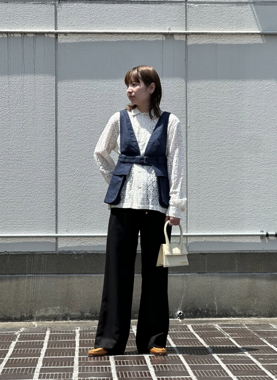 レースのシャツは一枚あると、着まわしも効いて万能! 羽織るのはもちろん、ブラウスのようにベストやビスチェに重ねて取り入れるとコーデの今っぽさが際立ちます。