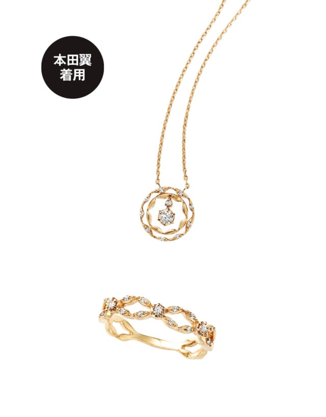 毎年人気の4℃ホリデーコレクション。今回は、静寂に包まれた冬の朝、透き通る光と雪の煌めきを思わせるデザインで登場。ネックレスは、朝の光のヴェールを透かしで、日差しを浴びて輝く雪の粒をクリアなダイヤモンドで表現。リングにはダイヤモンドを贅沢にちりばめて。ラフなデニムスタイルに、キャッチーなイエローゴールドと上質なダイヤモンドで大人の品格を添えて。