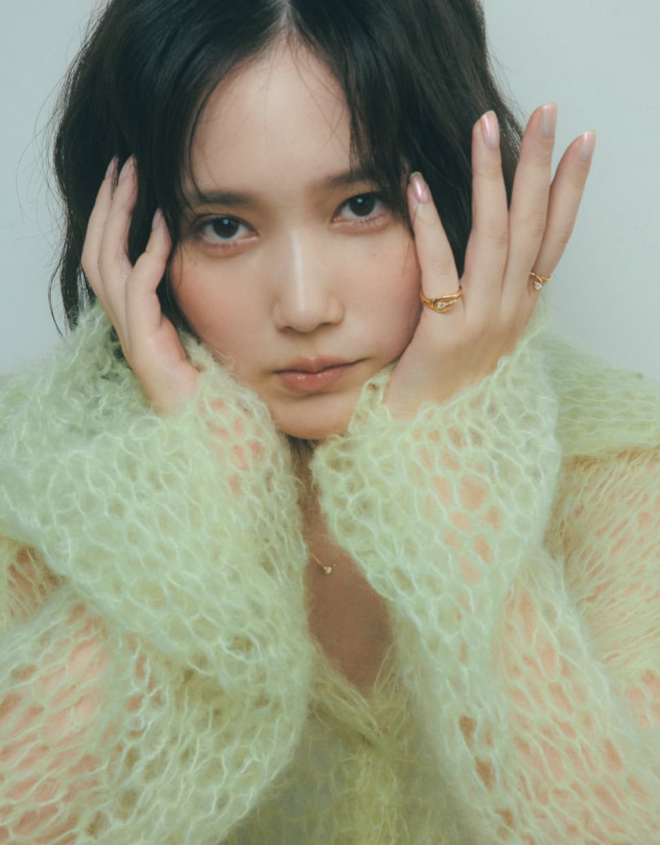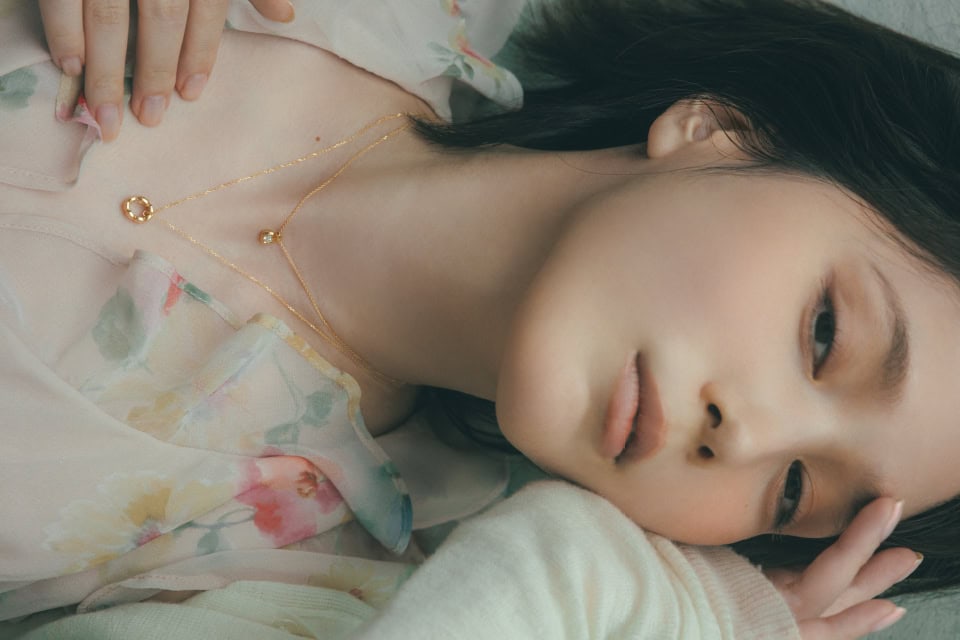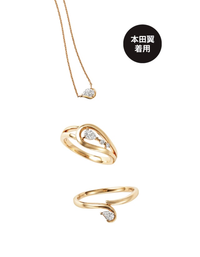 鑑定書付きの数量限定ダイヤモンドジュエリーをラインナップする「Precious Diamond」シリーズ。“Drop in the water(はじまりのひとしずく)”をイメージしたネックレス&リングは、熟練の職人による、4℃オリジナルの美しいリープカットダイヤモンドをセッティング。ふんわりと柔らかな表情のニットに、アシンメトリーでひねりをきかせたデザインのネックレスでスパイスを。