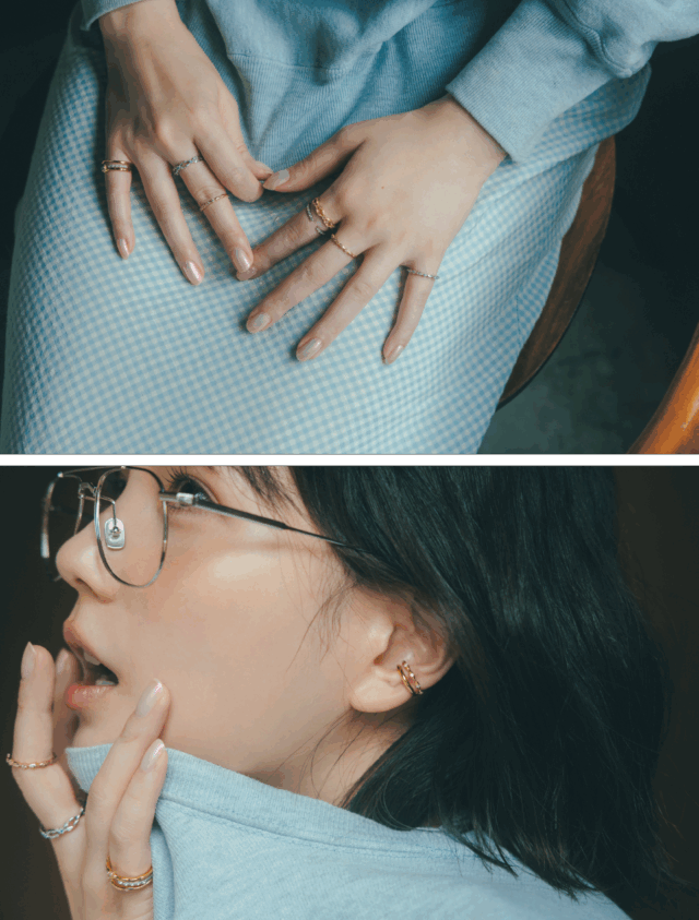 存在感溢れるホリデーコレクションのリングを組み合わせて。3連セットリングやアームをダイヤモンドで埋め尽くしたリング、プラチナにアイスブルーダイヤモンドとメレダイヤモンドのリング……。多様なデザインの重ねづけが今の気分にマッチ。服やメイクと同じように、自由なスピリットでスタイリングを選択できるのも大人ならではの醍醐味。
