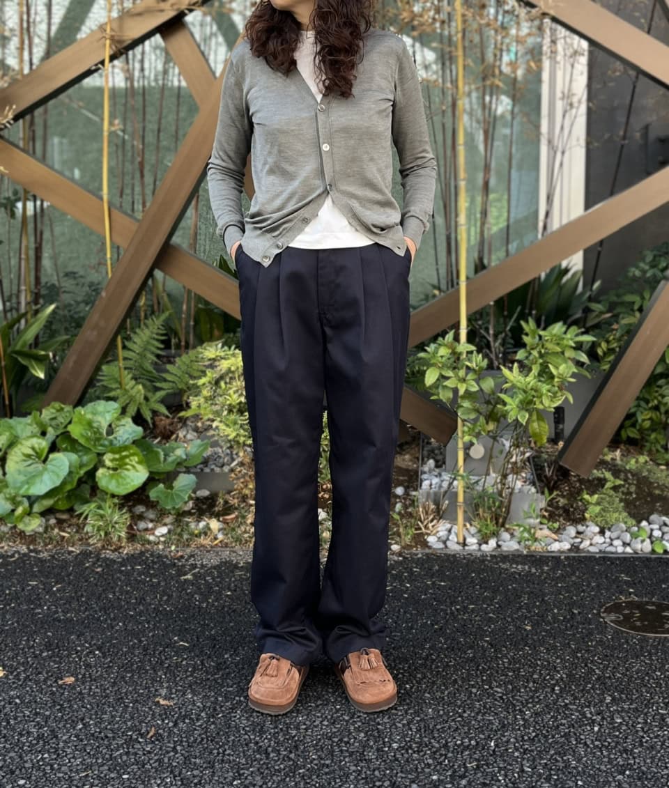 で、まずはこの絶妙なシルエットを堪能したかったので、ハイゲージのカーディガン×Tシャツのシンプルなトップスに合わせてみました。色合わせもシンプルなので「地味に見えすぎちゃうかも」って心配したのですが、トムボーイパンツのシルエットが独特なので洒落た印象に仕上がっていますよね。これにはちょっとびっくりです。全体的にゆったりとしているのですが、野暮ったく見えることなくすっきり着こなせるのもさすがのひと言。【シンゾーン】の定番ボトムスとして、長く愛されている理由もここにあるんじゃないかと思いました。
